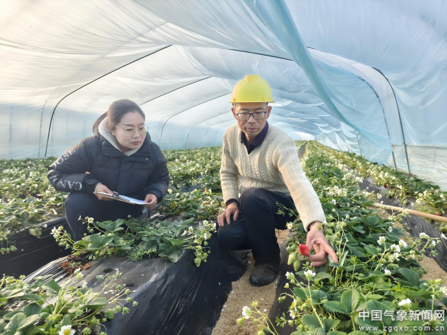 此外,农业气象技术人员还定期上门开展指导,帮助种植户熟练使用手机小程序实时查看温度、湿度等气象要素,科学调整灌溉、通风等措施,让气象科技成为草莓管理的“好帮手”。